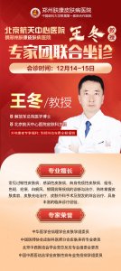 12月14日-12月15日(本周末),郑州肤康皮肤病医院为帮助河南疑难皮肤病患者早日实现健康无恙 解决“看病难、看病贵、看专家更贵”的问题特邀北京航天中心医院王冬教授莅临肤康进行联合会诊。